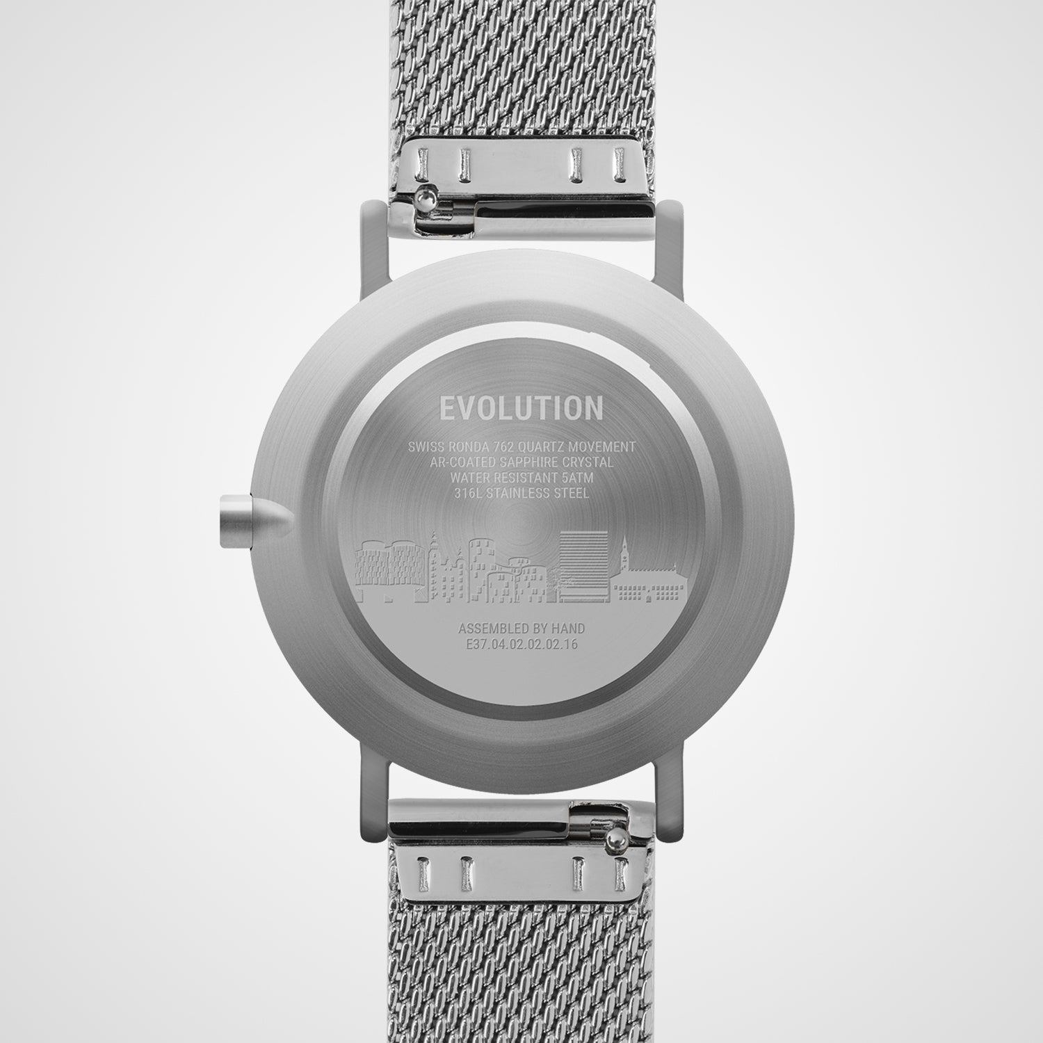 Evolution is hand-assembled around a Swiss movement, which is covered by a lifetime warranty.