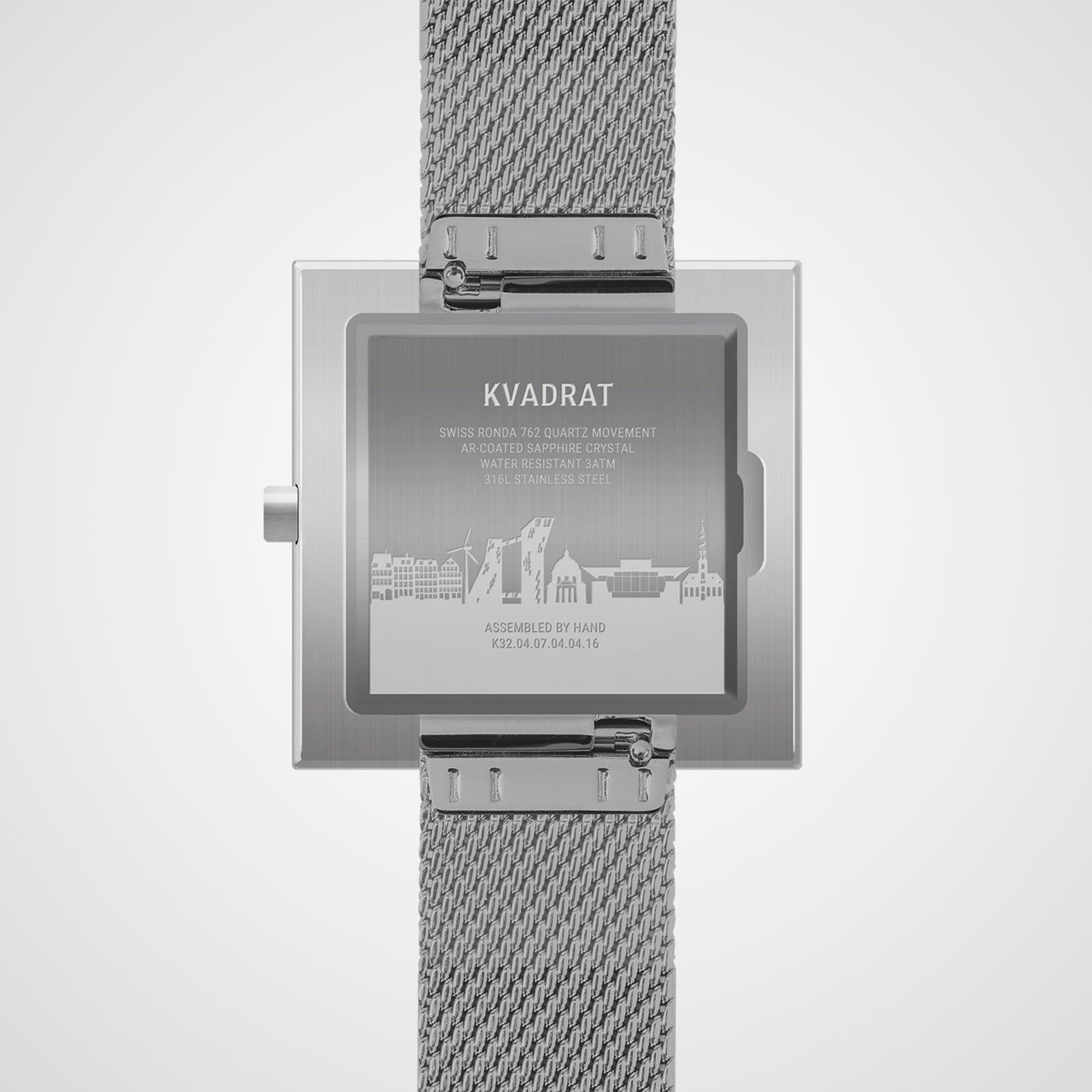 Kvadrat is hand-assembled around a Swiss movement, which is covered by a lifetime warranty.